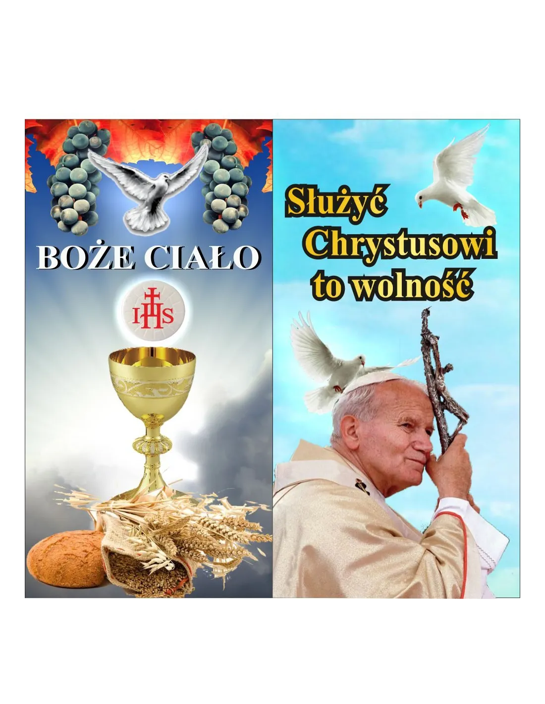 Ulicami alejami naszych miast i strojnymi ścieżkami polskich wsi idzie dzisiaj i porywa z sobą nas i zaprasza byśmy z nim zawsze szli. Wśród chorągwi, baldachimów, płatków róż. Pośród barwnych wstęg koronek w blasku dnia , idzie Ten w którego wierzysz – to sam Bóg . Zstąpił z nieba, by zobaczyć, jak się masz . Jest obecny w białej Hostii po to by wzrokiem wiary człowiek patrzył w jego twarz. I obiecał, że po wszystkie nasze dni – aż do końca świata-będzie pośród nas