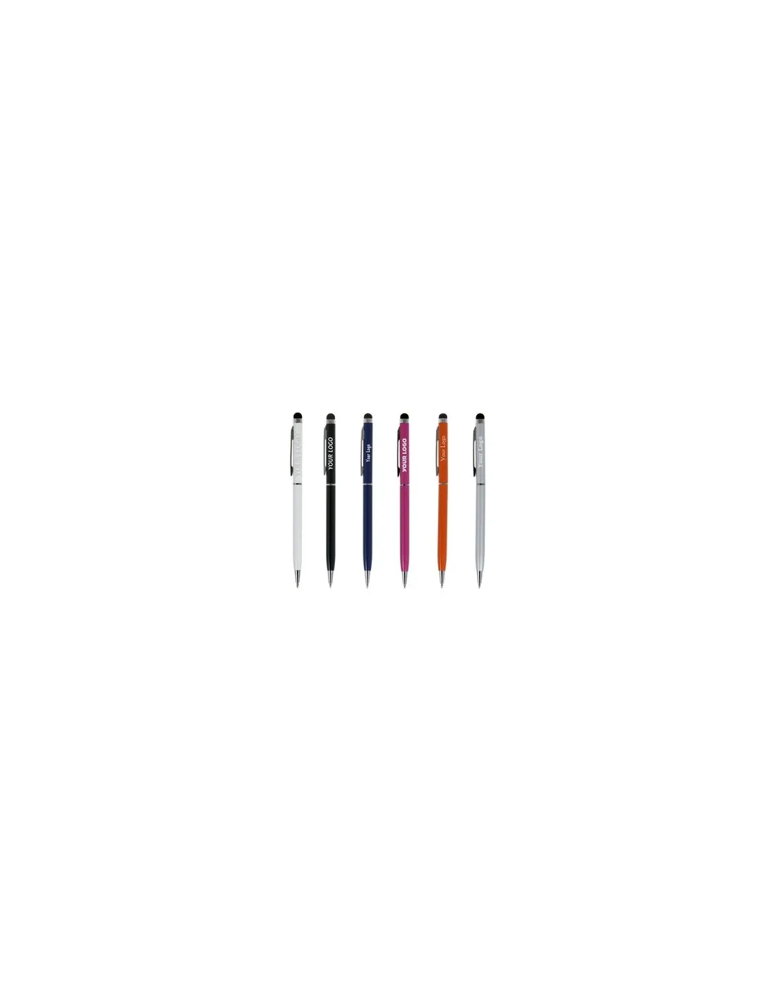 • Długopis, touch pen z kolorowym korpusem i srebrnymi elementami w 6 kolorach : biały, srebrny, czarny, różowy, pomarańczowy, granatowy.