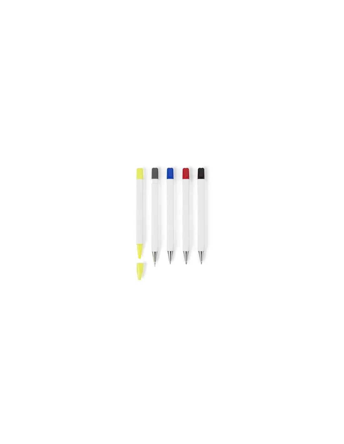 • Zestaw piśmienny, ołówek, zakreślacz oraz 3 długopisy z wkładem w kolorze nakrętki, w plastikowym etui