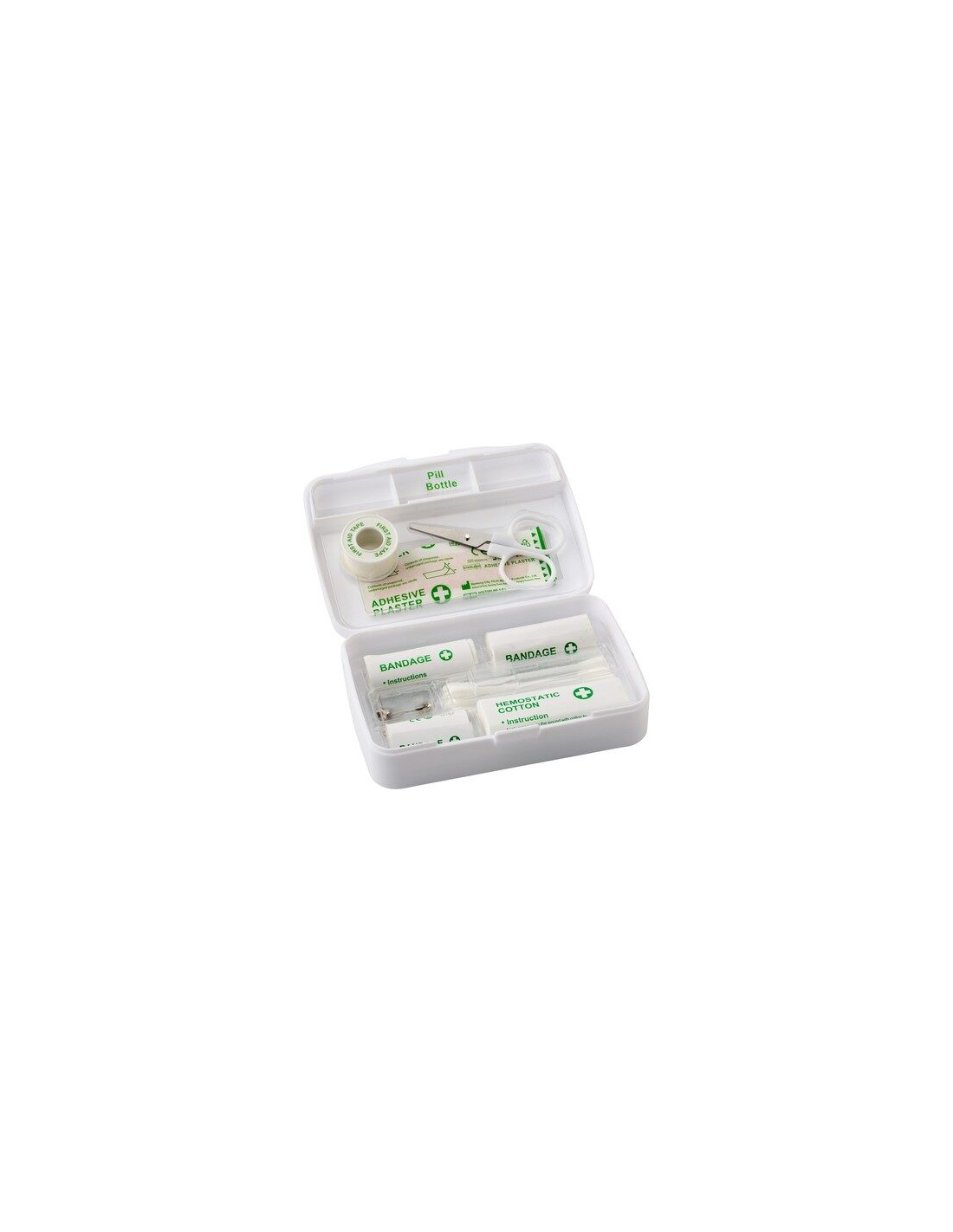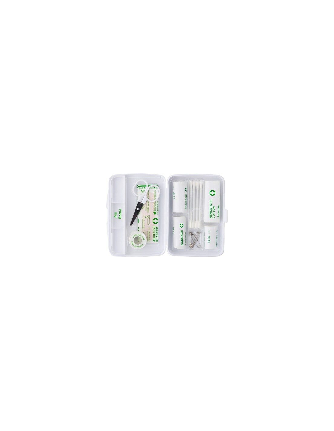 • Apteczka w plastikowym opakowaniu, 23 el., w tym: taśma, nożyczki, 5 plastrów samoprzylepnych, bandaże (3,3 x 100 cm, 4,5 x 100 cm oraz 4,5 x 150 cm), hemostatyczna bawełna, 8 wacików i 4 agrafki