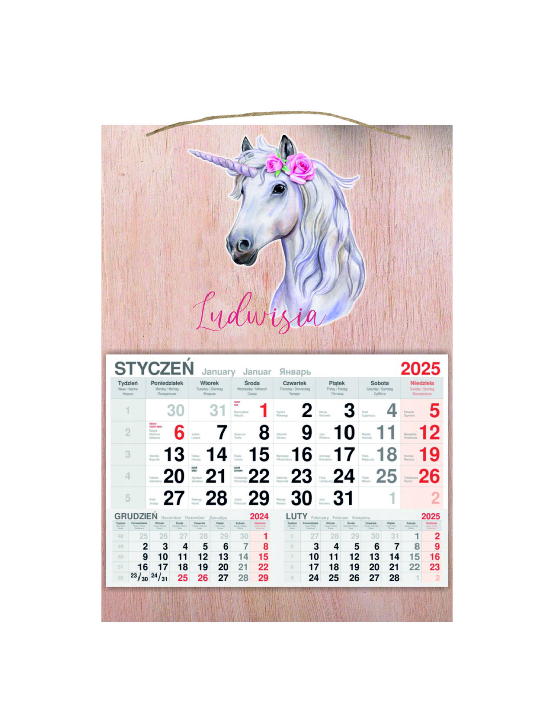 KALENDARZ wiszący 2025 jednodzielny DREWNIANY prezent na DZIEŃ dziecka jednorożec