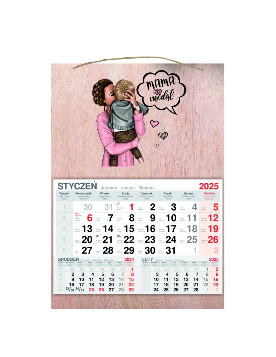 KALENDARZ wiszący 2025 jednodzielny DREWNIANY prezent na DZIEŃ MAMY