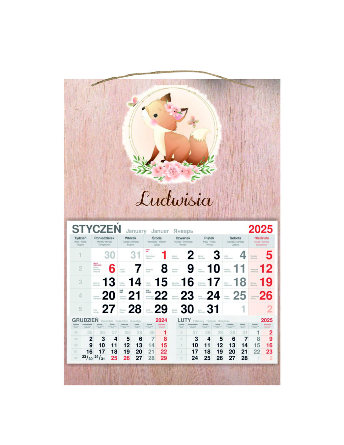 KALENDARZ wiszący 2025 jednodzielny DREWNIANY prezent dla dziecka z imieniem