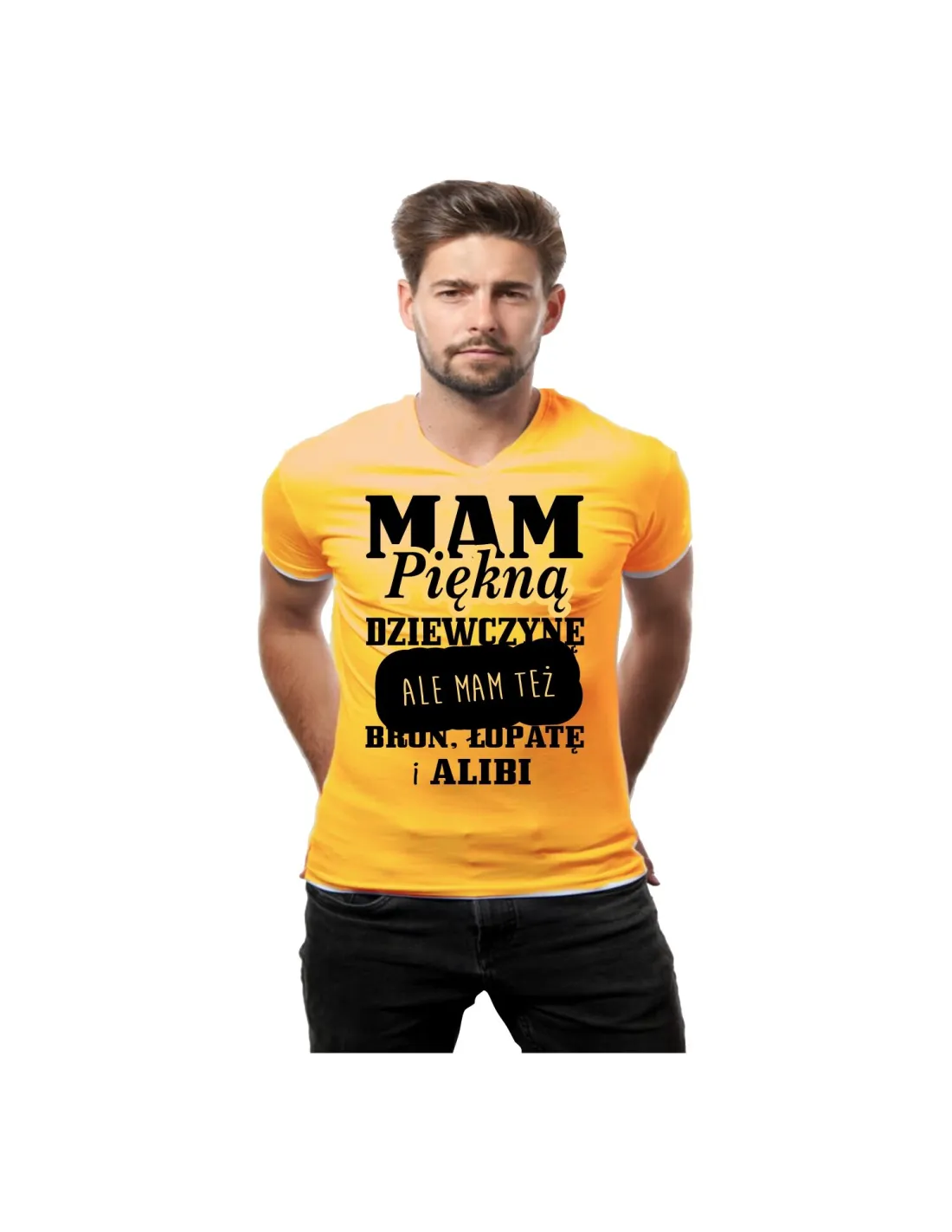 Koszulka z nadrukiem mam piękną dziewczynę ale mam też broń, łopatę i alibi