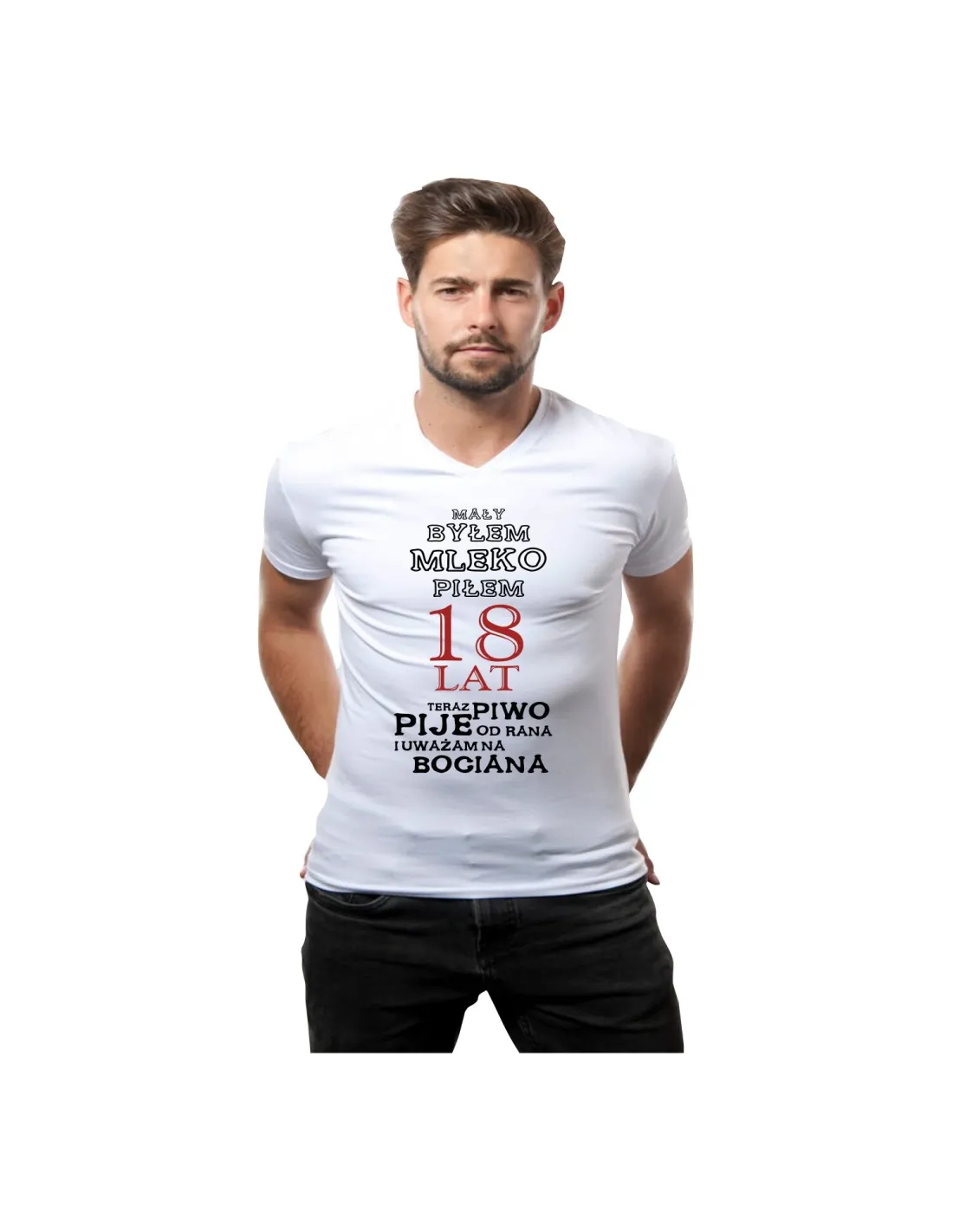 Koszulka z nadrukiem na 18 urodziny Mały byłem mleko piłem 18 lat teraz piwo pije od rana i uważam na bociana