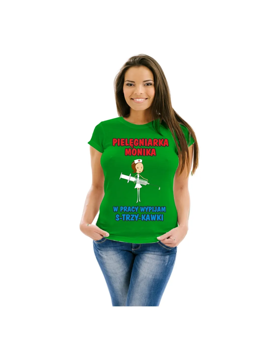 Koszulka z nadrukiem pielęgniarka imię w pracy wypijam s-trzy-kawki prezent dla pielęniarki