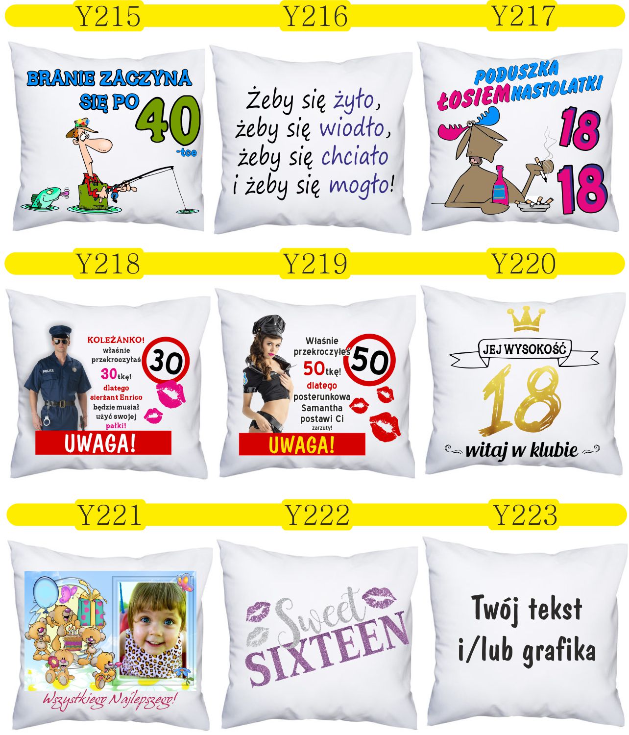 Przykładowe wzory poduszek z nadrukiem: