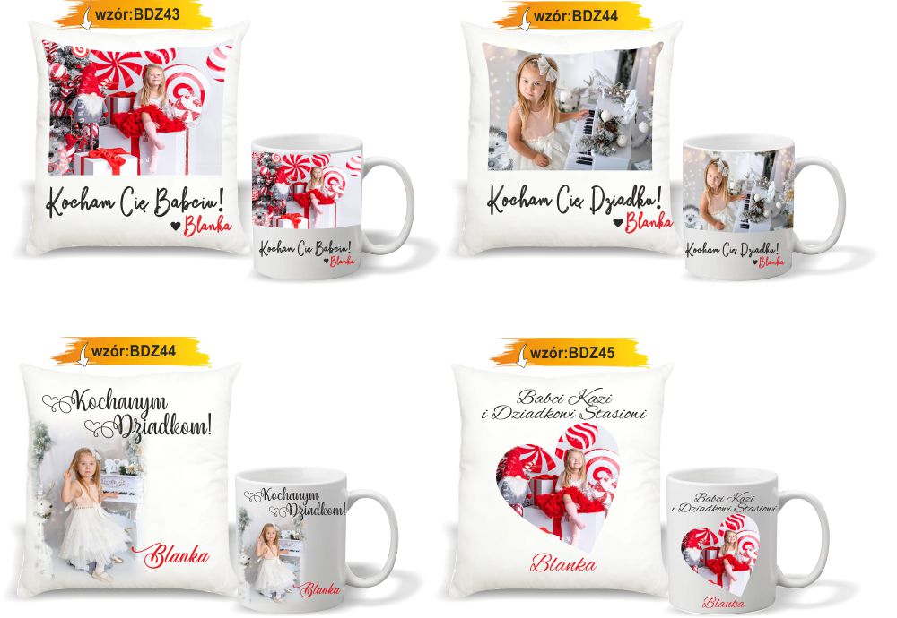 Przykładowe wzory zestawów Foto Poduszka + Foto Kubek z nadrukiem: