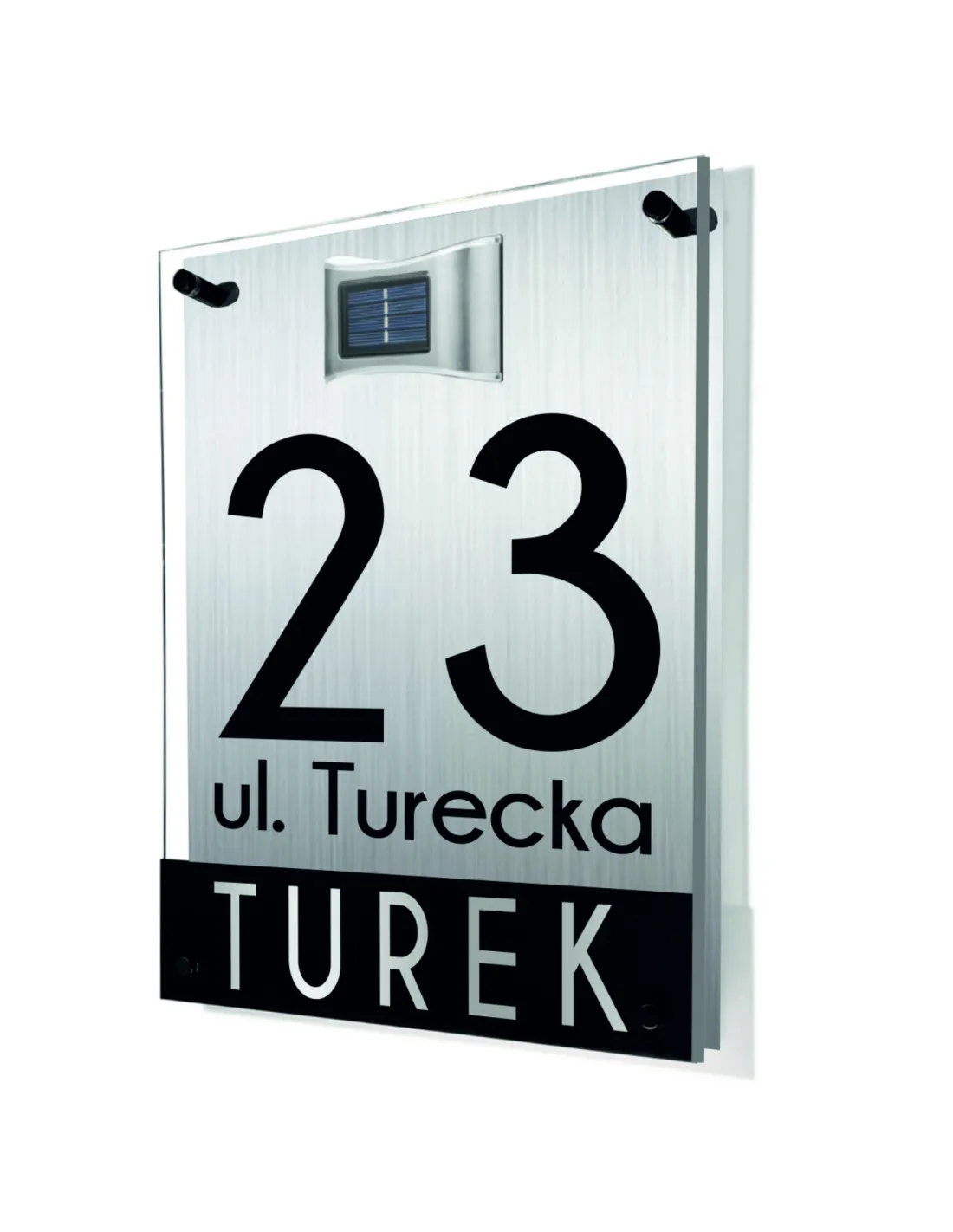 • Numer domu/ulica/miejscowość wykonane z plexi, czarnej lub mleczno-białej, przyklejone są do przeźroczystej plexi