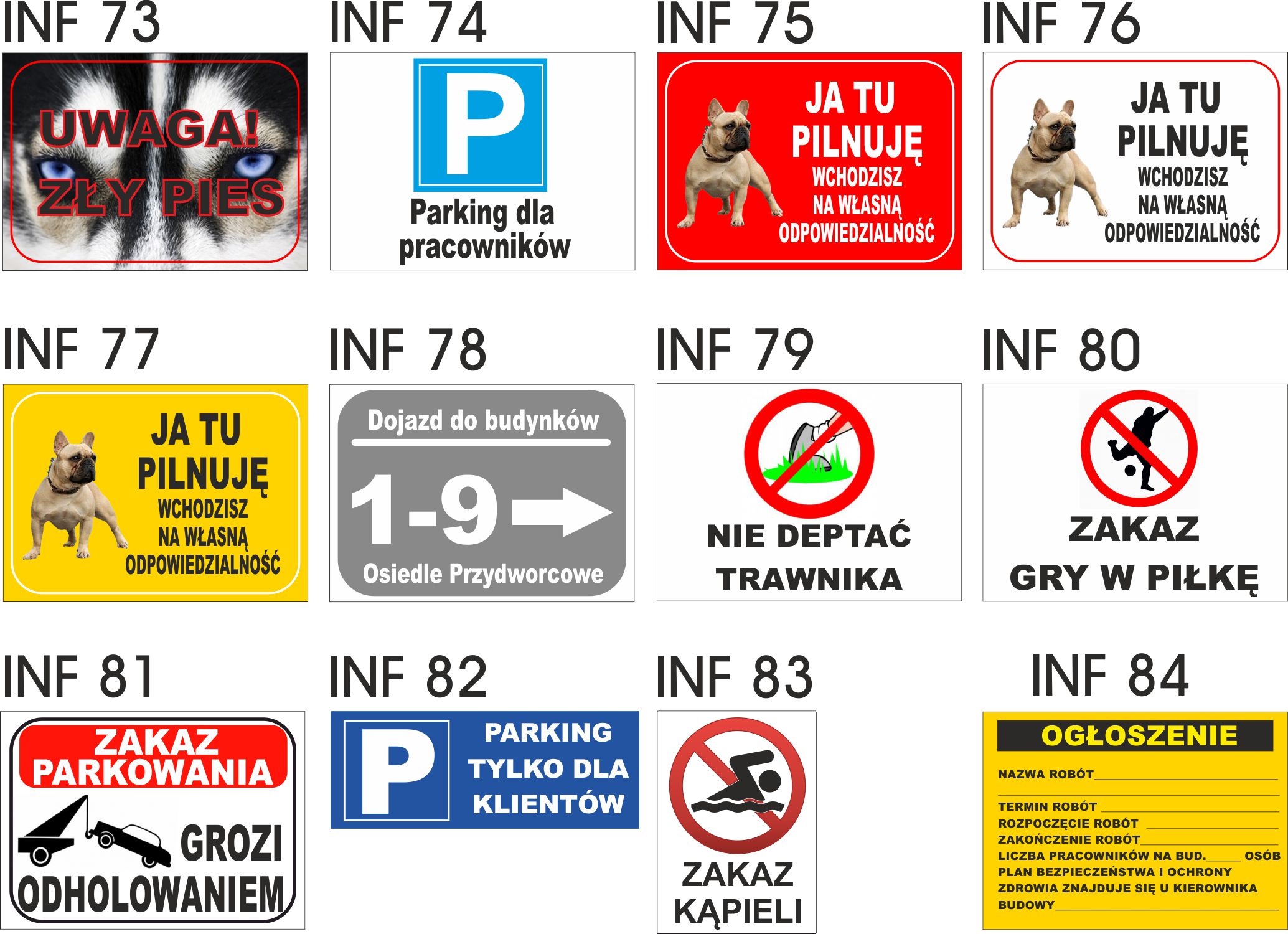 • tablice przeznaczone do stosowania na prywatnych posesjach, terenach firmowych (nie spełniają parametrów znaków drogowych)