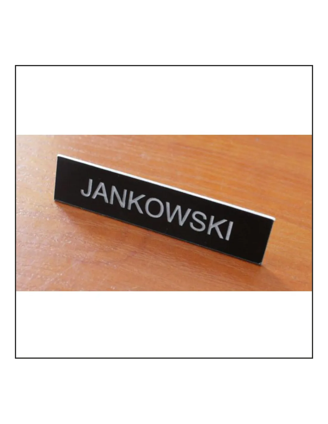 Czarny laminat, biały grawer, standardowa czcionka.