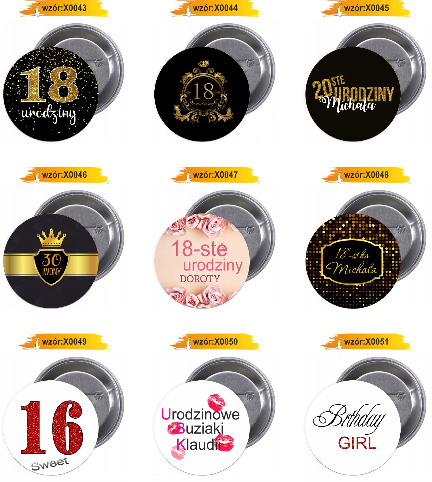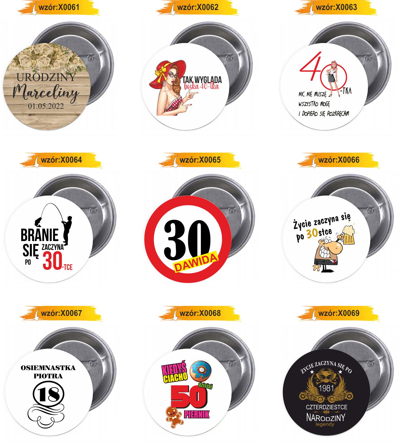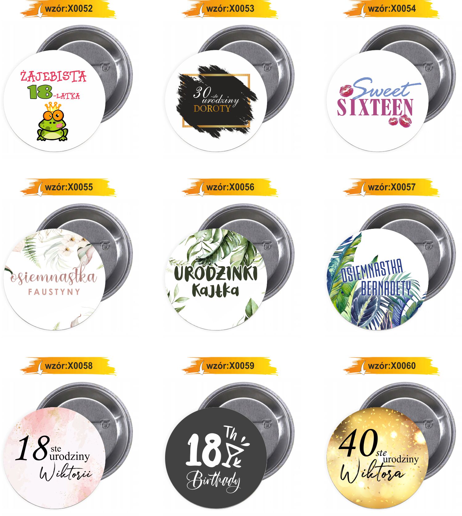 Dostępne gotowe wzory przypinek i buttonów: