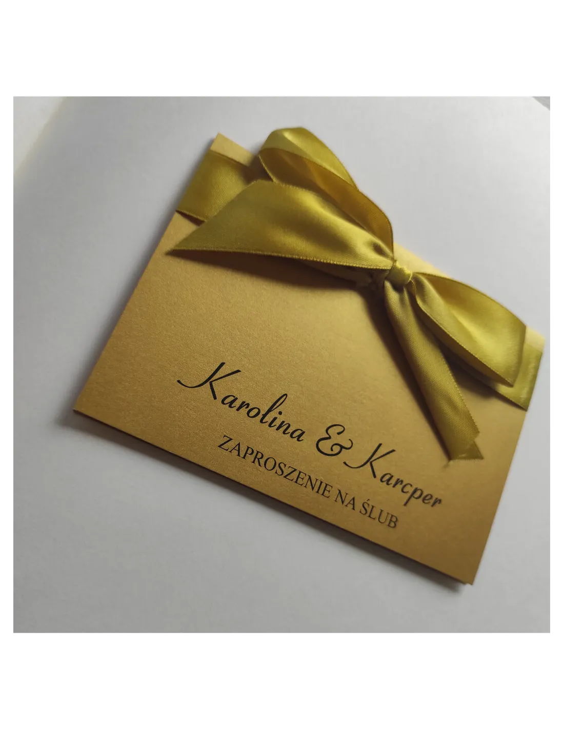 Eleganckie złote zaproszenia Ślubne na Wesele z kokardą na ŚLUB